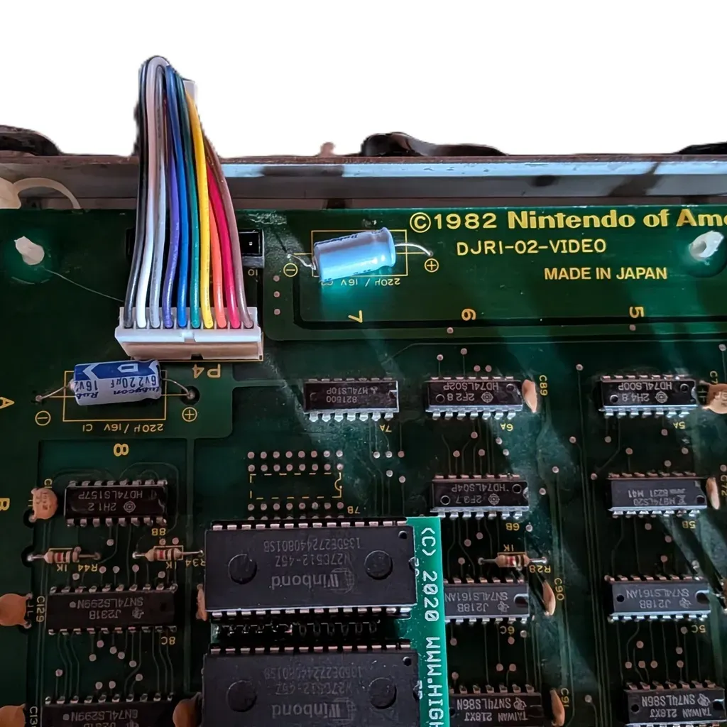 This Nintendo Rainbow Power Cable, Part #DJR-89-11 is a 10 pin power harness connector between the CPU and Video pcbs of a two board Nintendo stack.