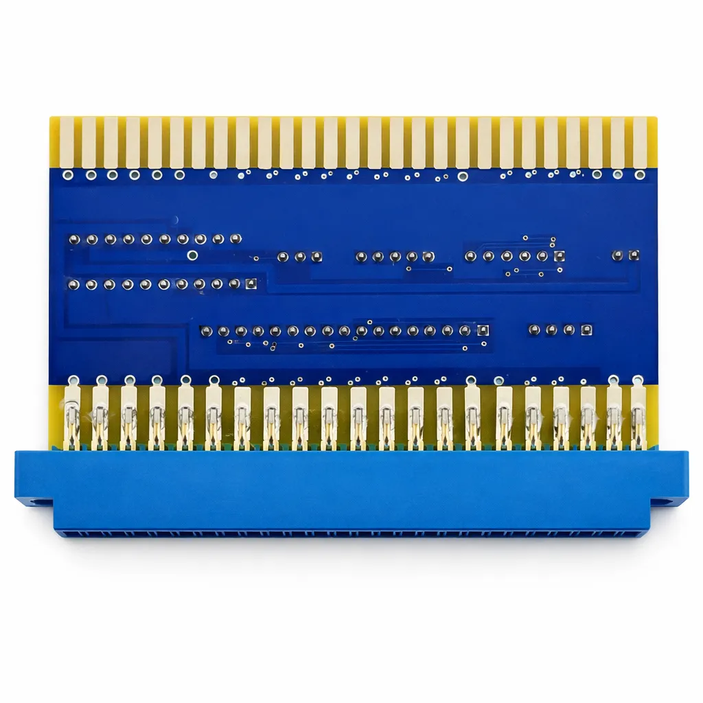 This adapter converts the original pin-style cabinet wiring harness found in classic Donkey Kong and Donkey Kong Jr. cabinets to the newer card-edge connector used on later Nintendo board sets—making swaps and upgrades fast and reversible.