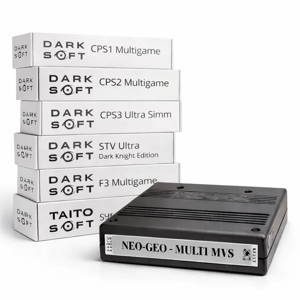 Darksoft multigame kits run multiple games on original arcade PCBs without emulation, preserving authentic timing, sound, and gameplay while expanding game libraries.