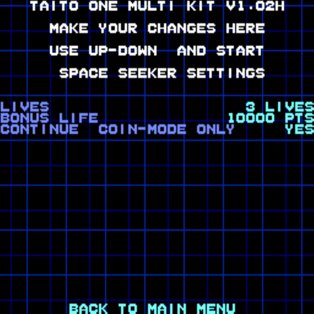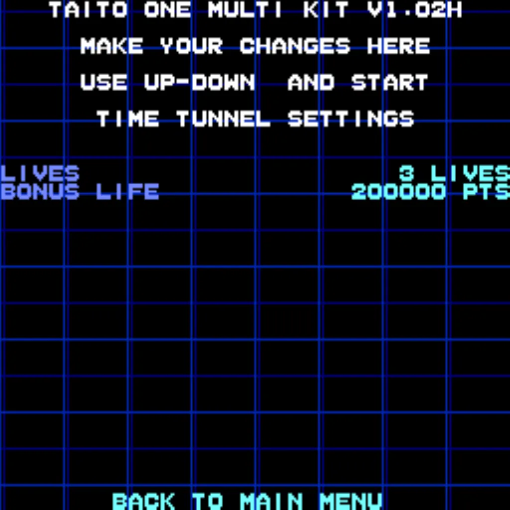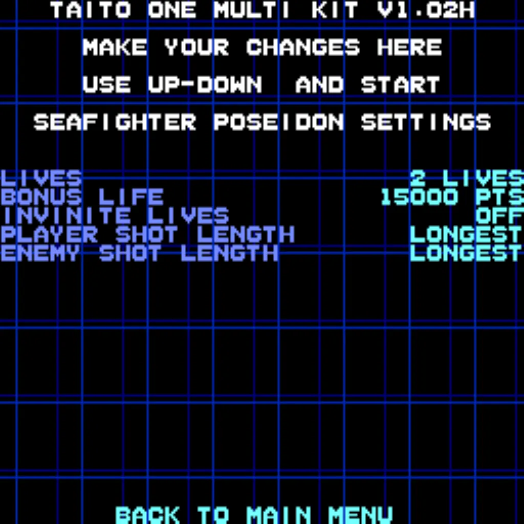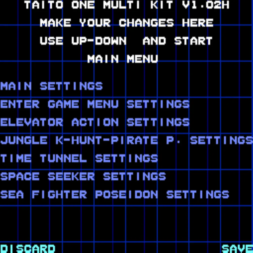 - Game selection — Choose from Elevator Action, Jungle King, Jungle Hunt, Pirate Pete, Time Tunnel, Space Seeker, and Seafighter Poseidon.