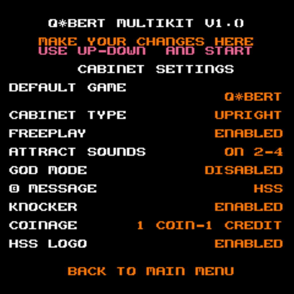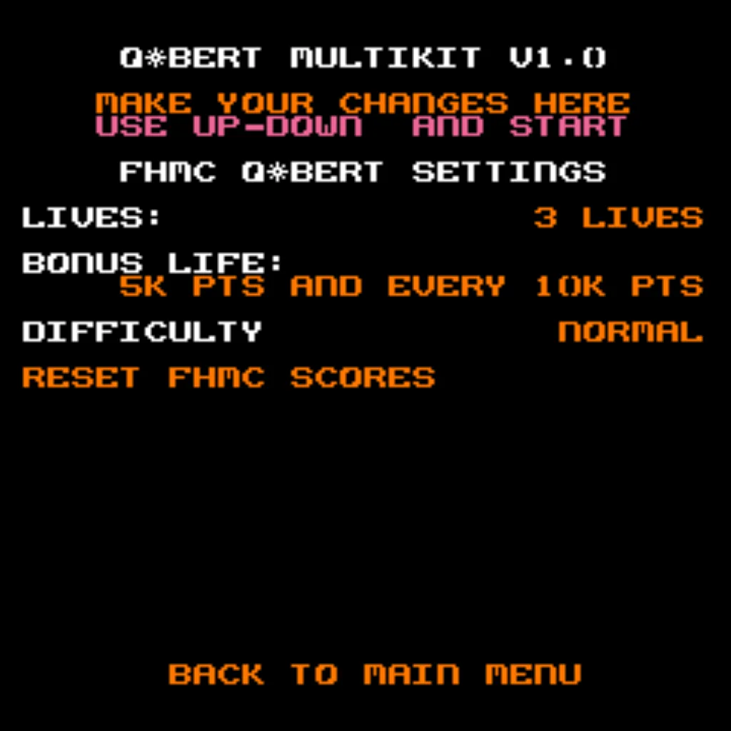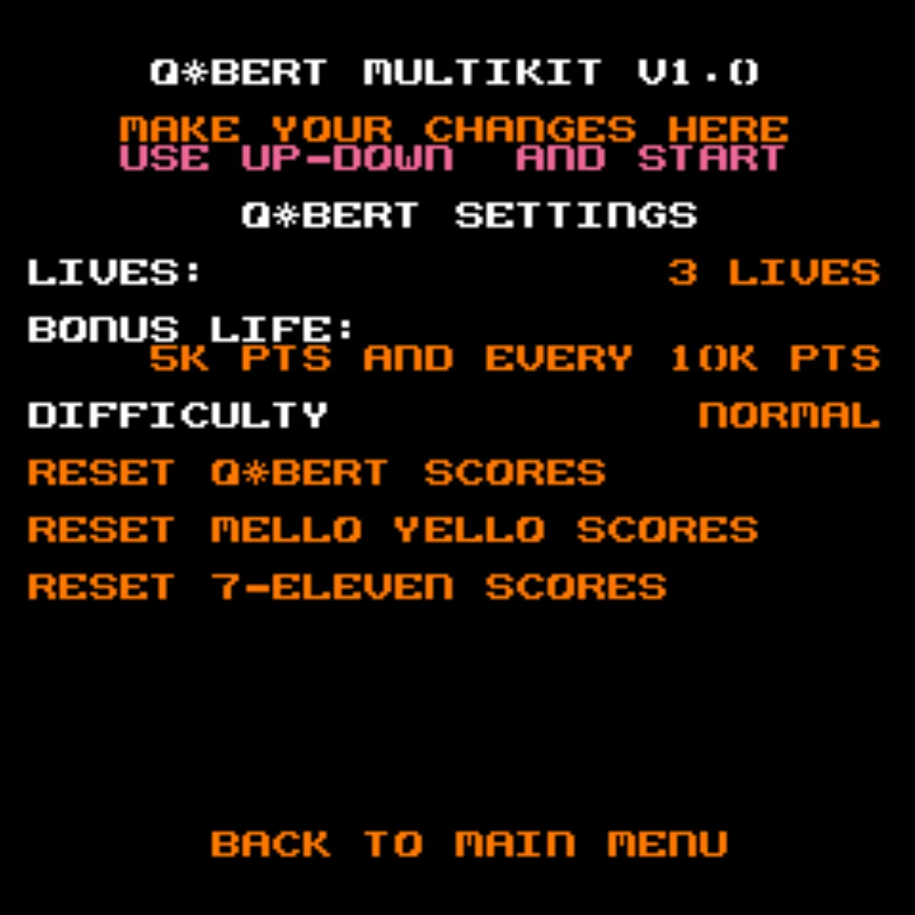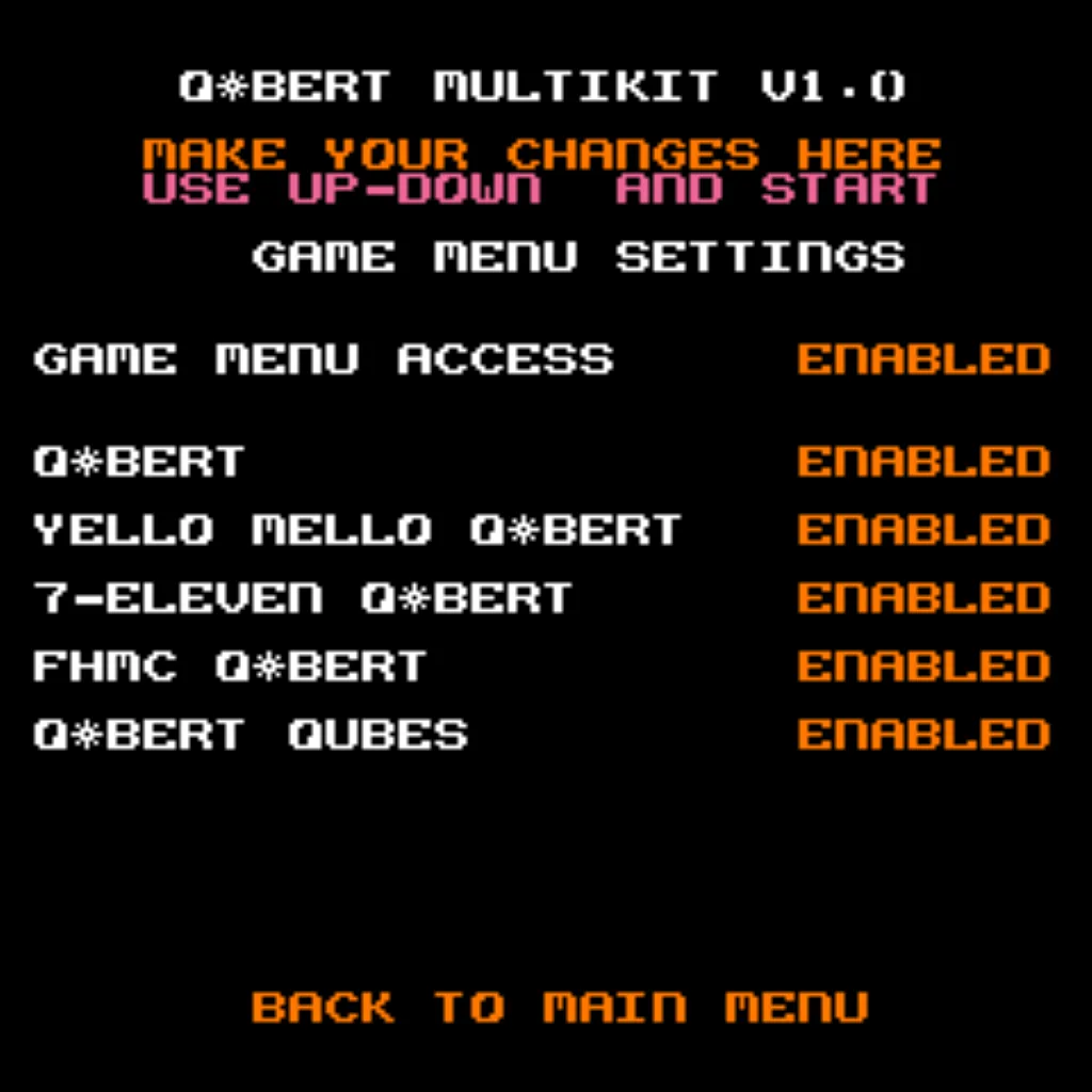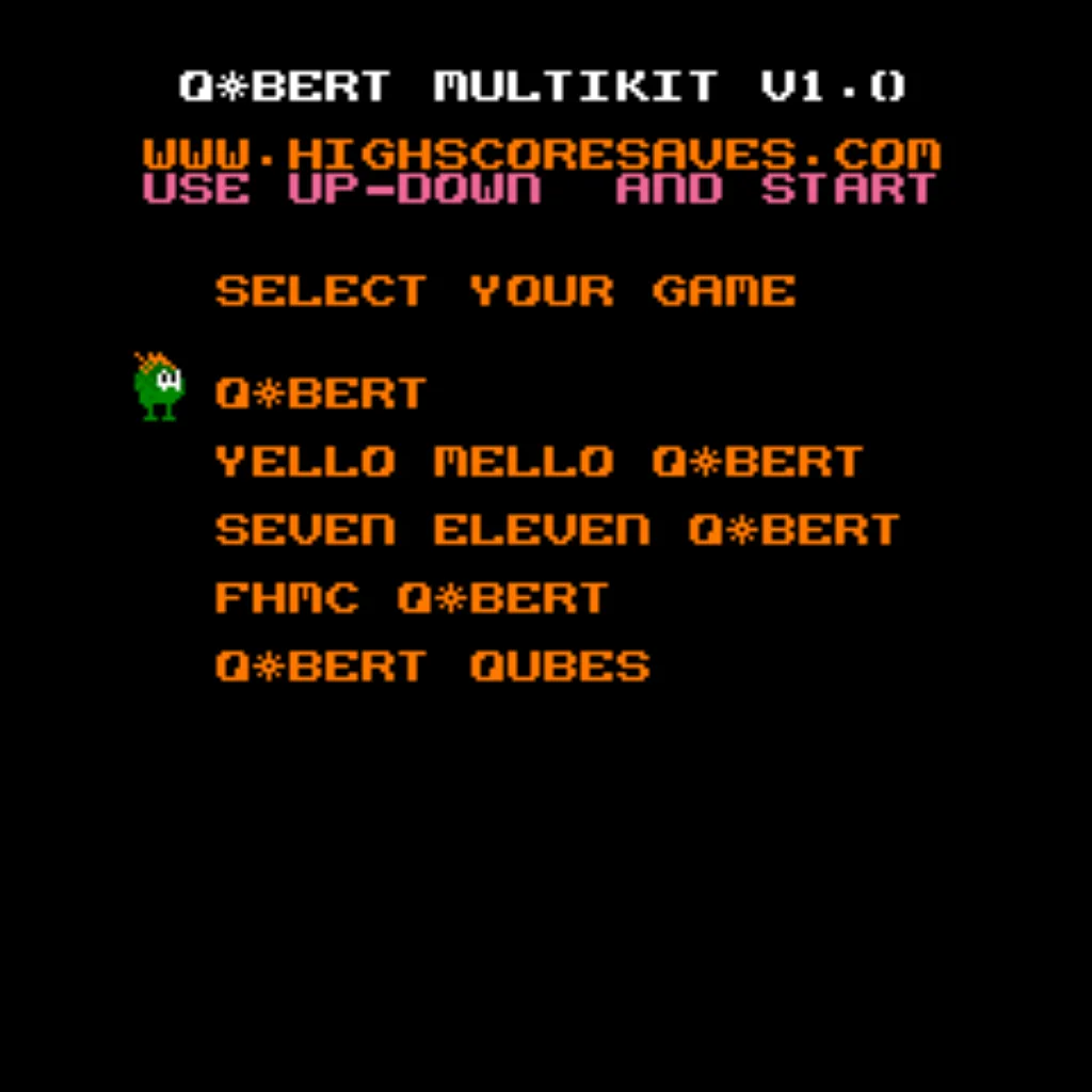 - Boot options: Start at the Game Menu or boot directly into Qbert, Qubes, FHMC, Mello Yello, or 7-Eleven variants.