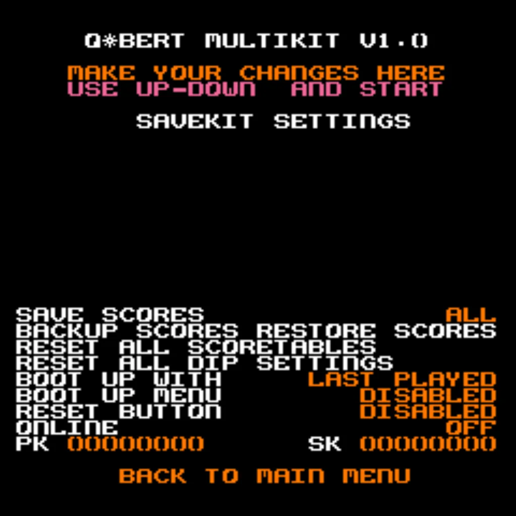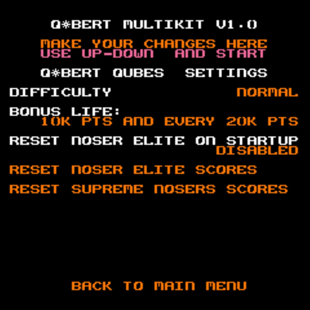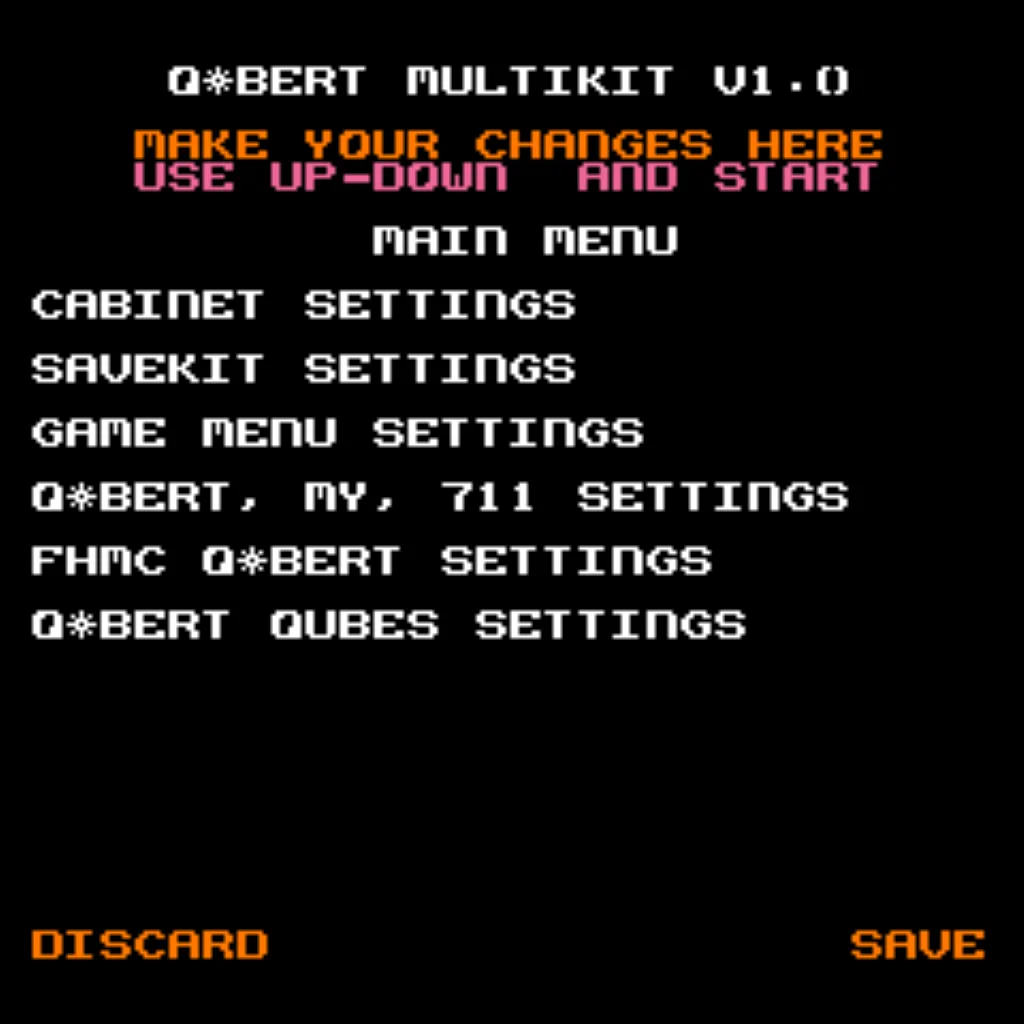 Multigame support for the entire Q*bert family, with menu or direct-boot options. Keep original gameplay while adding modern conveniences like Free Play, persistent high scores, attract sounds, and menu-driven DIP settings.
