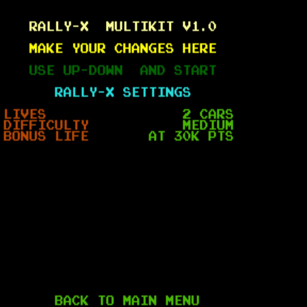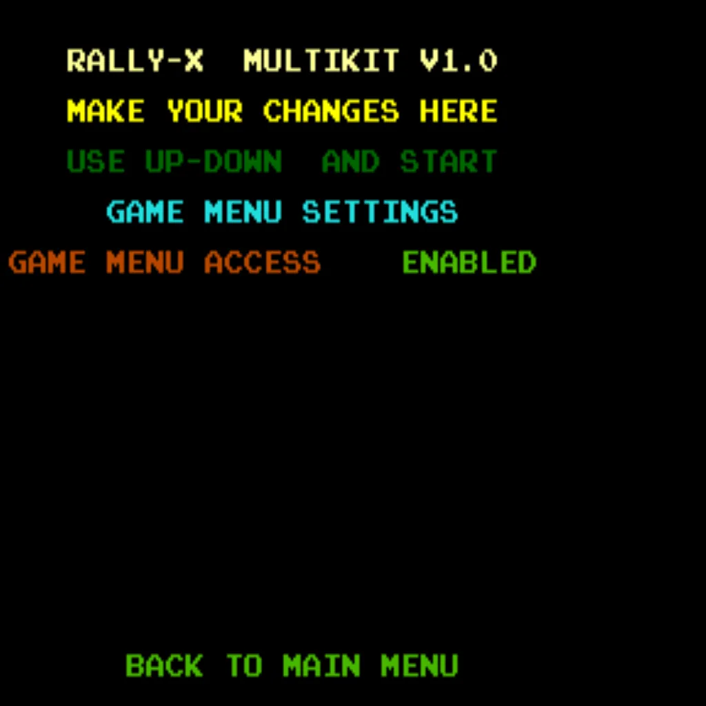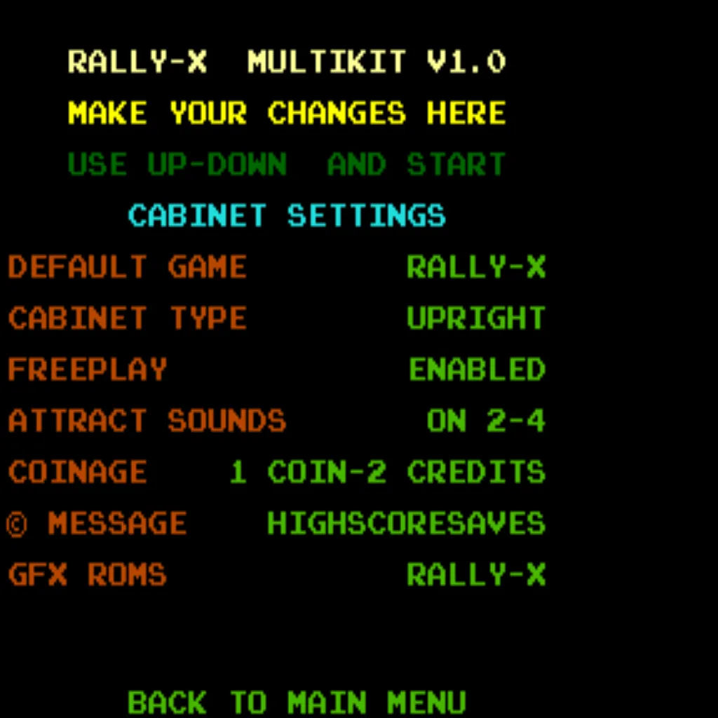 - Graphics ROM setting: After installing the Rally X save kit, open the settings menu and set your GFX ROMs option to “Multikit”.