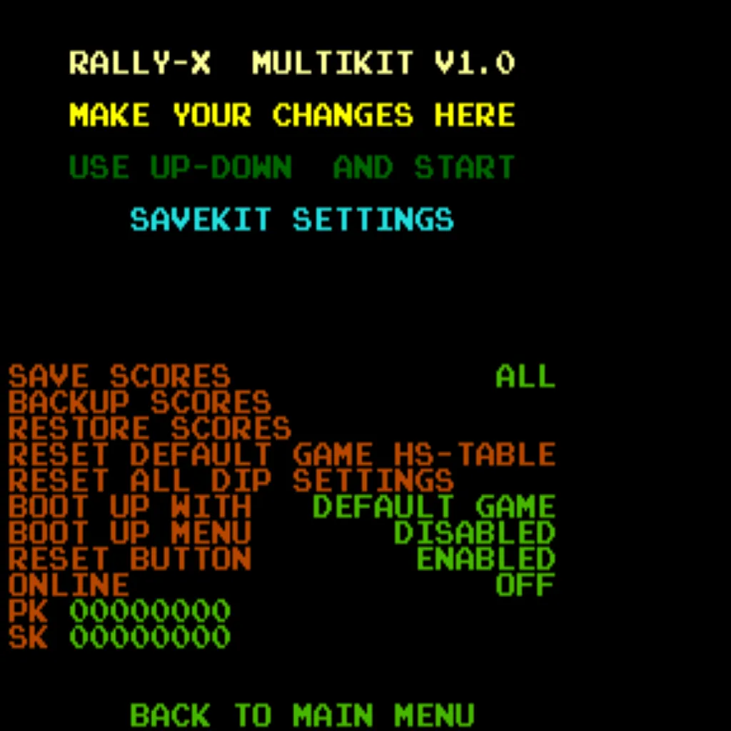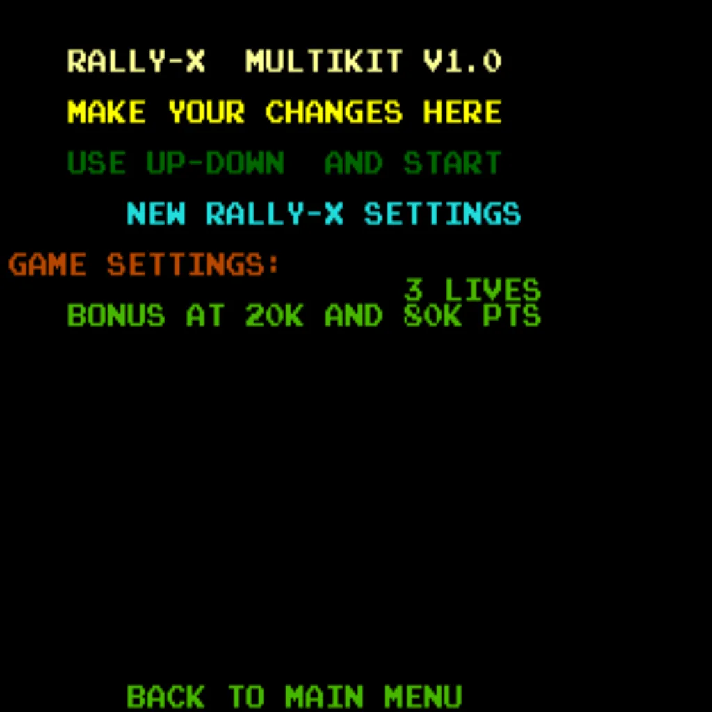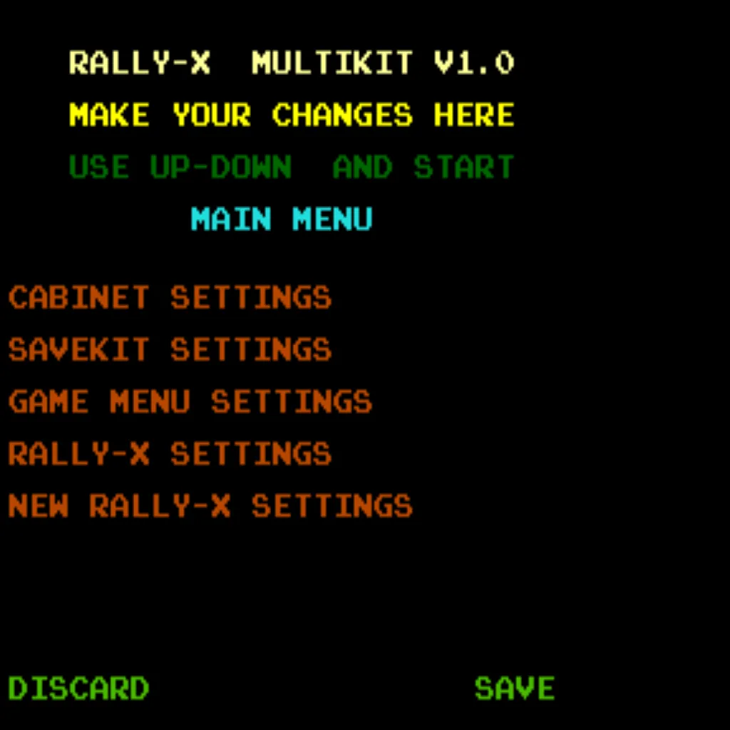 - Graphics ROM setting: After installing the Rally X save kit, open the settings menu and set your GFX ROMs option to “Multikit”.