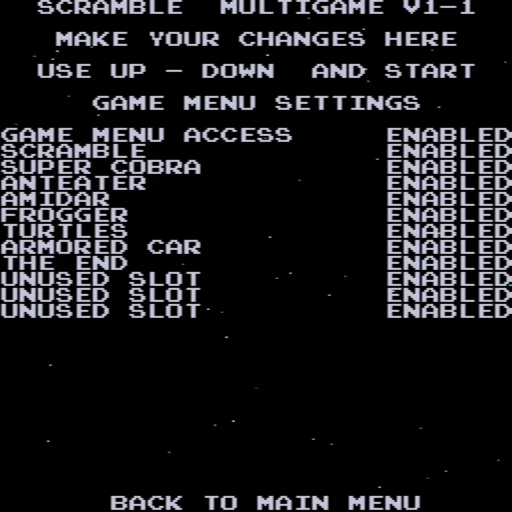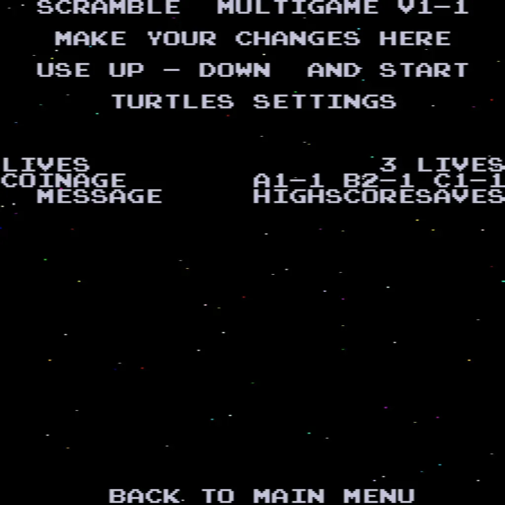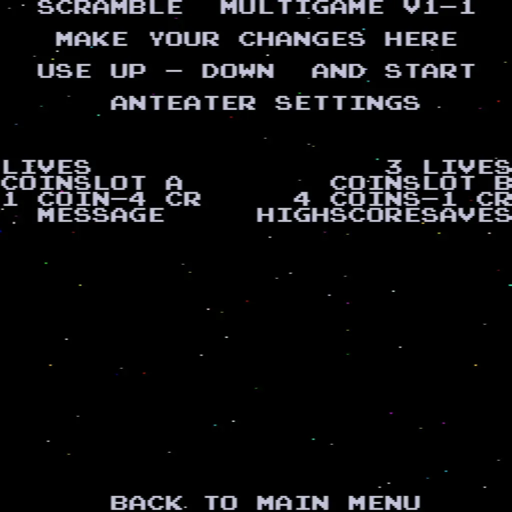 - Choose your game – Scramble, Super Cobra, Anteater, Frogger, Amidar, Armored Car, Turtles, and The End.