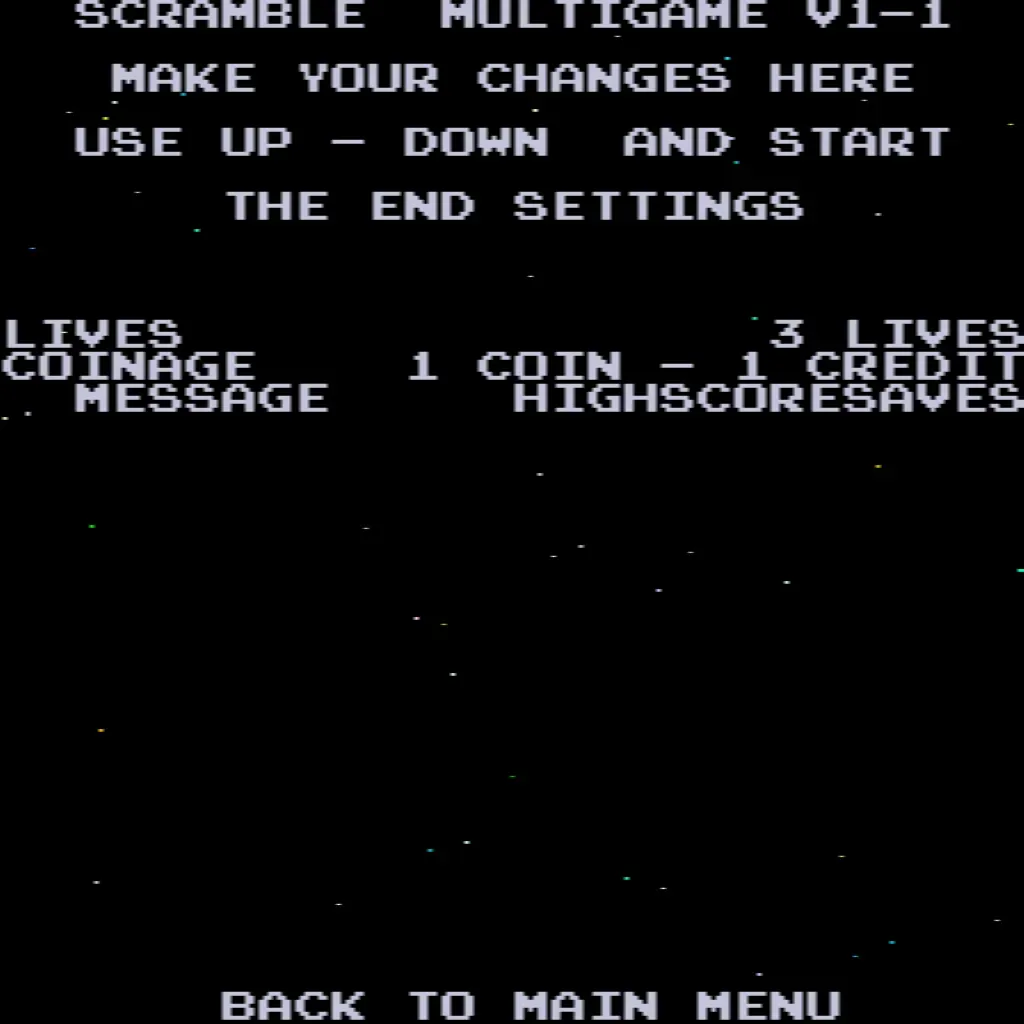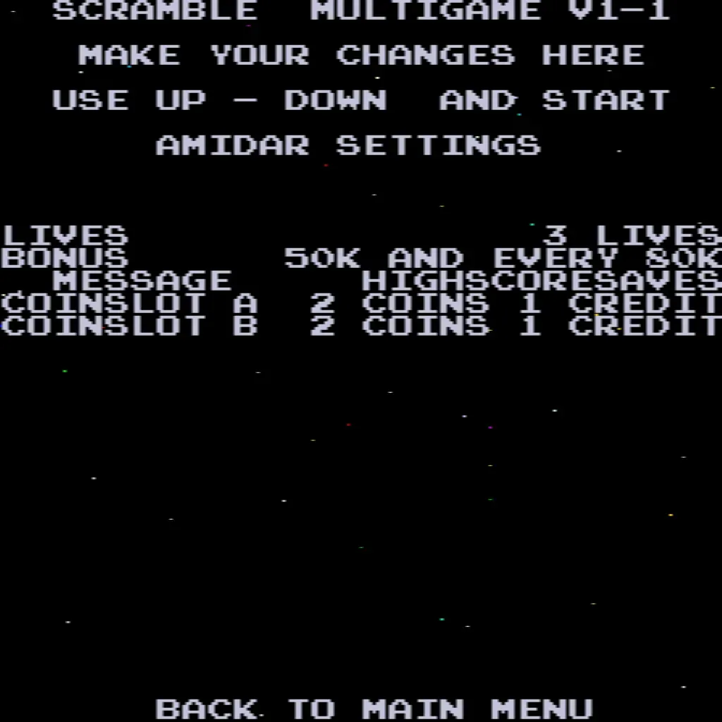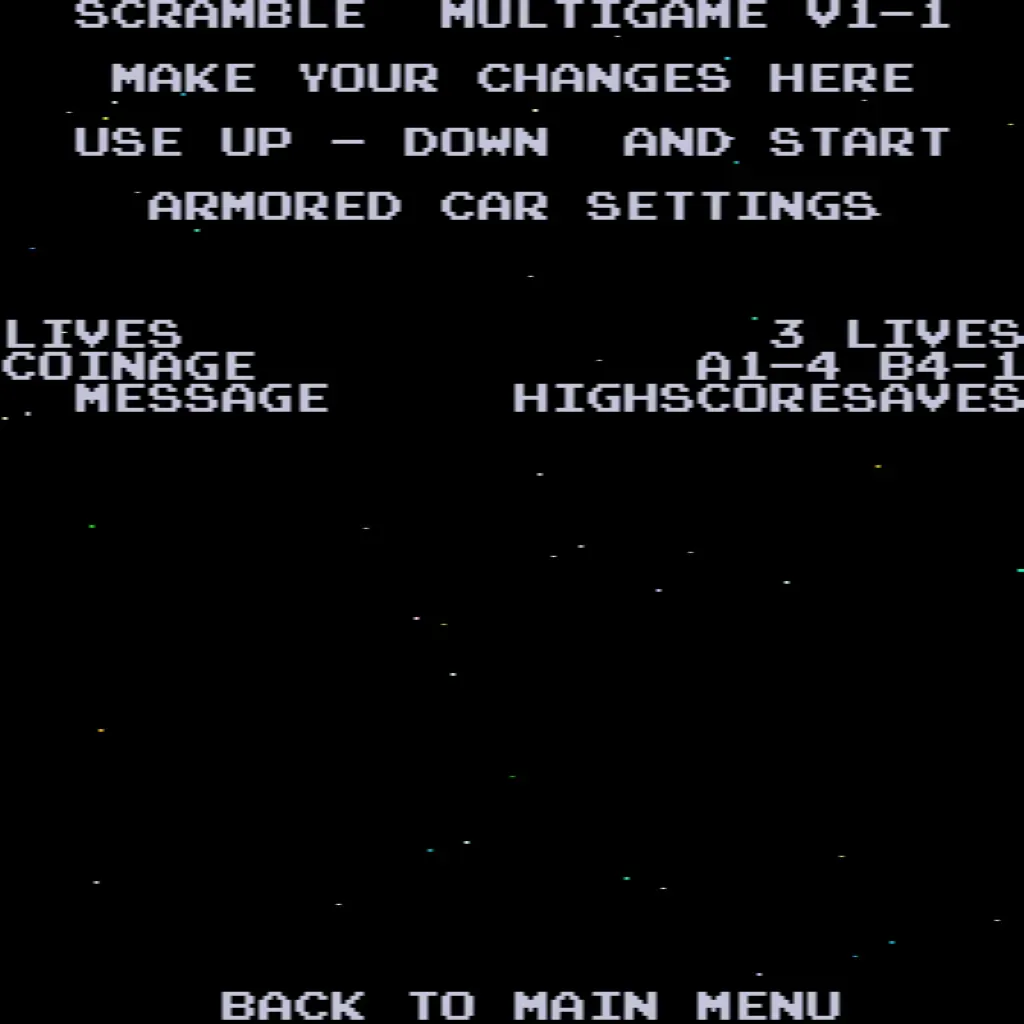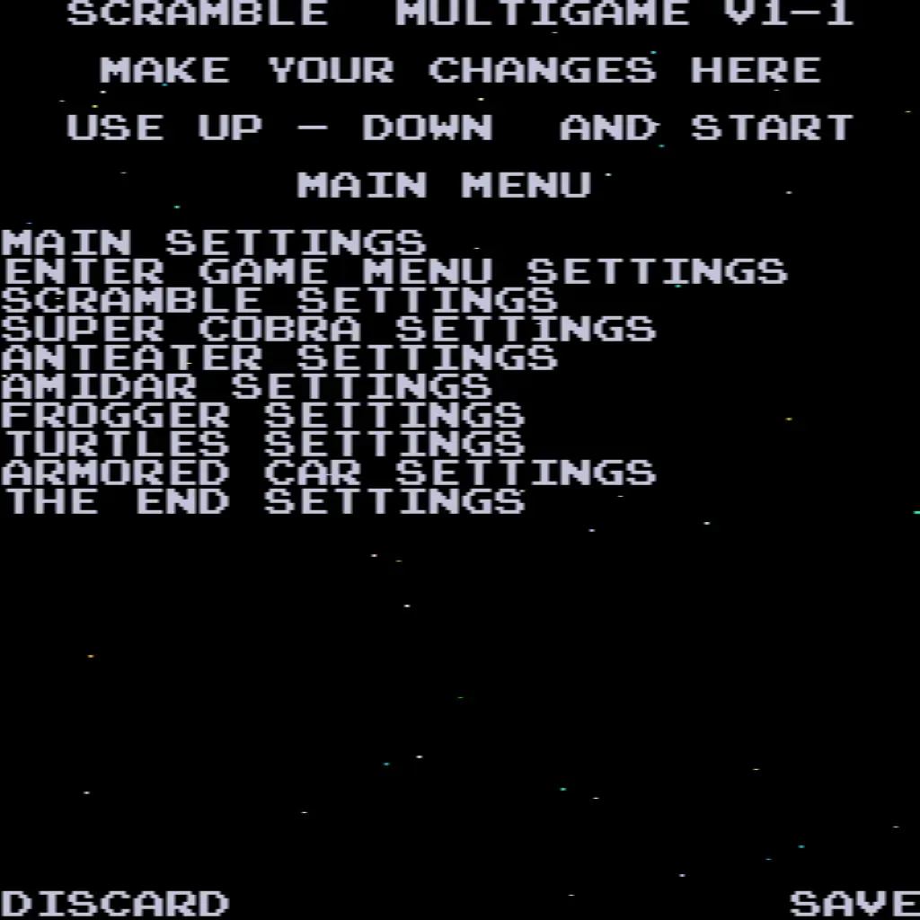 - Choose your game – Scramble, Super Cobra, Anteater, Frogger, Amidar, Armored Car, Turtles, and The End.