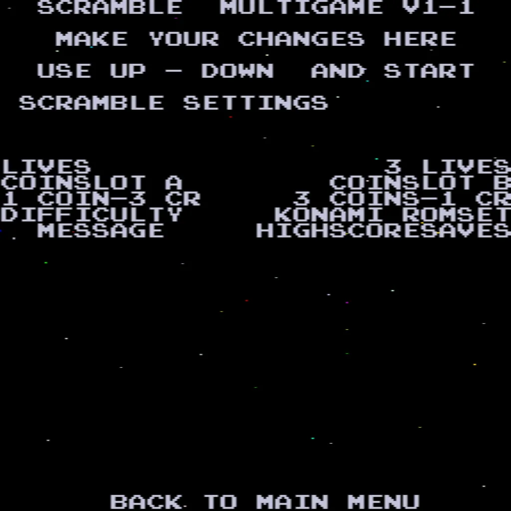 - Choose difficulty between Konami and Stern (Stern ROMs drain fuel faster).